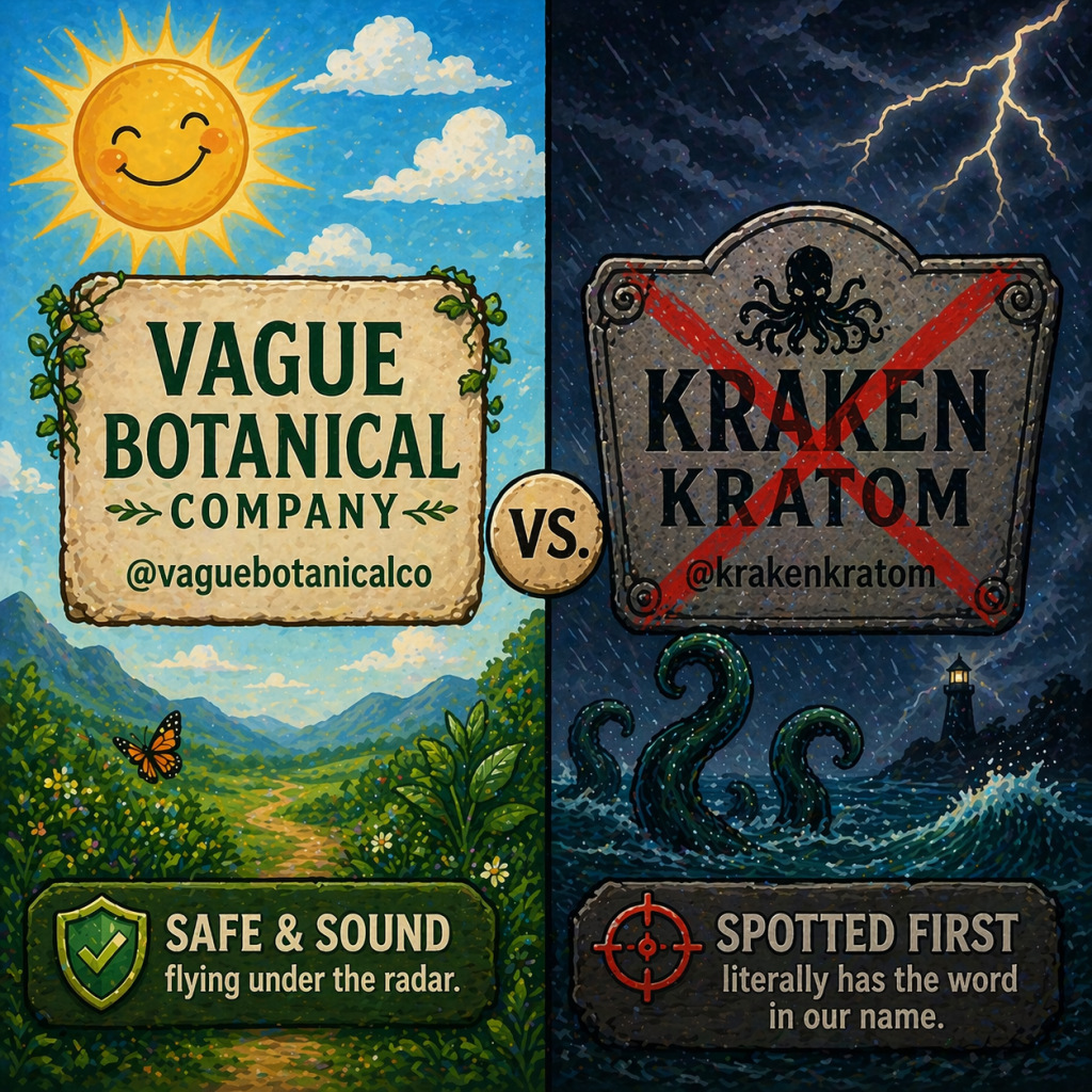 We, on the other hand, are Kraken Kratom. One of the biggest, most recognizable names in the space, with the word right there in our logo, our handle, and roughly every other sentence we’ve ever posted. We’re basically the lighthouse in a foggy harbor of keyword moderation. Of course we get spotted first.